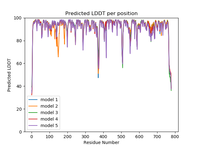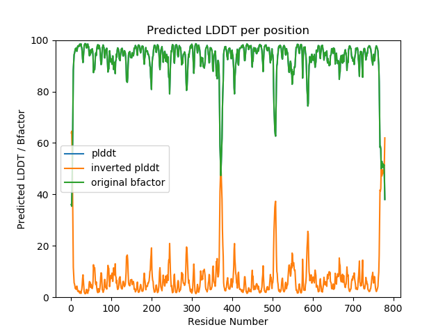 That should create the pdb-file, and a simple plot like the one below. In this case, the input-file contained already pLDDT as bfactors, so plots perfectly overlap: