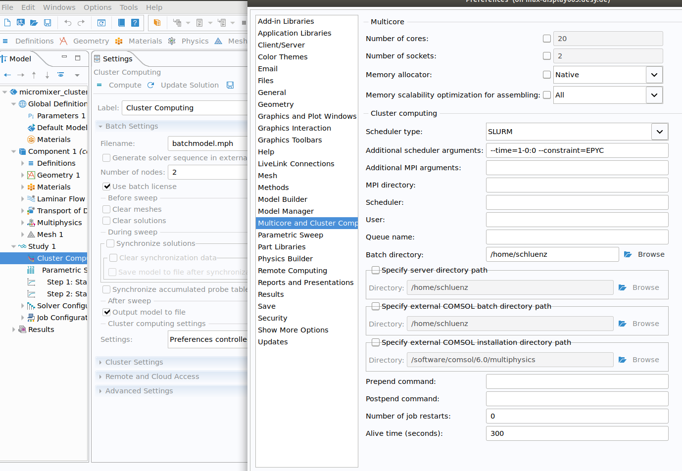 Note: the default runtime of jobs is usually 1 hour. Setting a different timelimit and possibly other batch parameters, you have to switch to "Preferences controlled" cluster setup, and set the preferences for "Multicore and Cluster Computing" as shown on the right. In that example, a runtime of 1 day and a constraint using only EPYC nodes has been.
