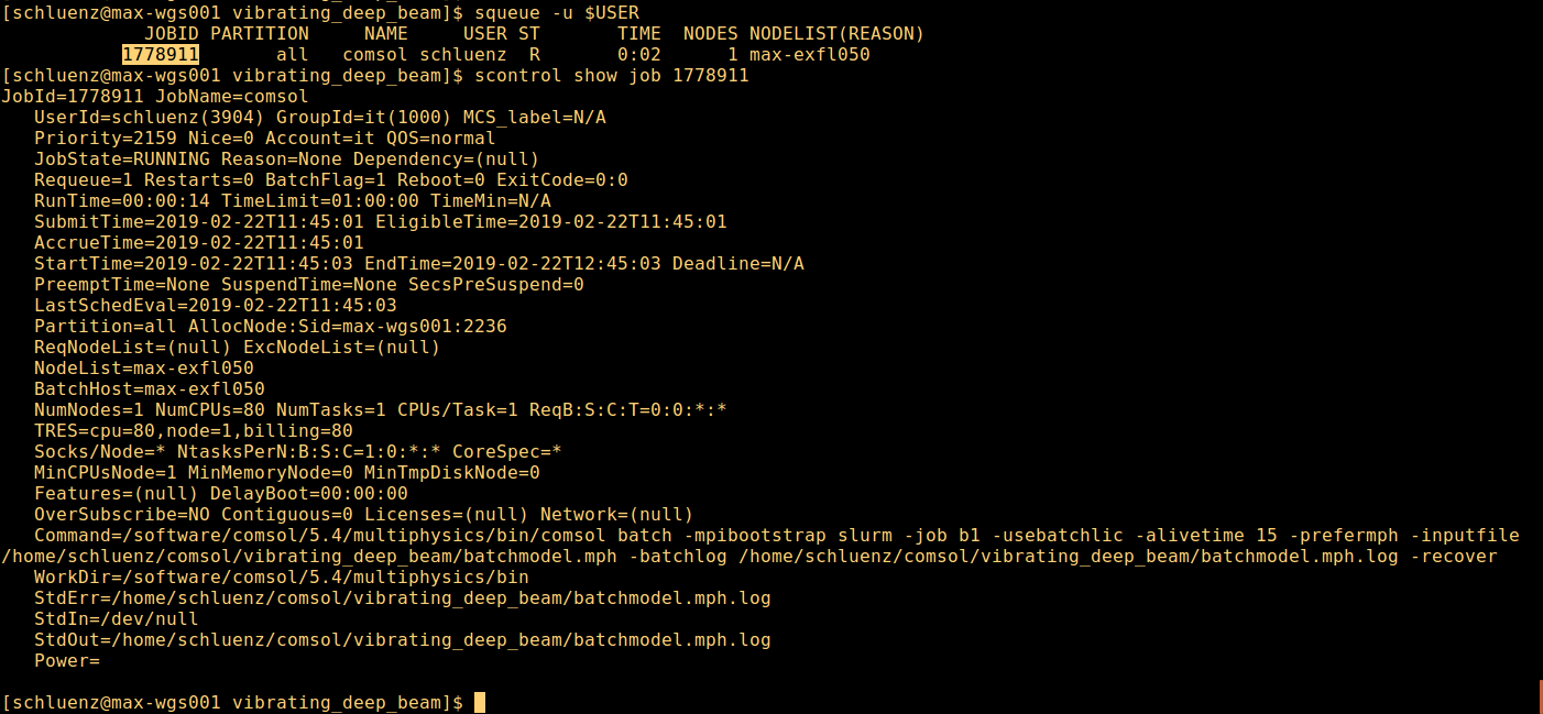 Once your job is running you can detect the job with the squeue command as shown. scontrol show job <jobid> is very handy, as it will expose the command used by comsol to launch the job.