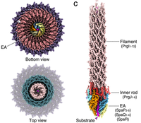 Many bacterial pathogens rely on virulent type III secretion systems (T3SSs) or injectisomes to translocate effector proteins in order to establish infection. The central component of the injectisome is the needle complex which assembles a continuous conduit crossing the bacterial envelope and the host cell membrane to mediate effector protein translocation. However, the molecular principles underlying type III secretion remain elusive. Here, we report a structure of an active Salmonella enterica serovar Typhimurium needle complex engaged with the effector protein SptP in two functional states, revealing the complete 800Å-long secretion conduit and unraveling the critical role of the export apparatus (EA) subcomplex in type III secretion. Unfolded substrates enter the EA through a hydrophilic constriction formed by SpaQ proteins, which enables side chain-independent substrate transport. Above, a methionine gasket formed by SpaP proteins functions as a gate that dilates to accommodate substrates while preventing leaky pore formation. Following gate penetration, a moveable SpaR loop first folds up to then support substrate transport. Together, these findings establish the molecular basis for substrate translocation through T3SSs and improve our understanding of bacterial pathogenicity and motility. Nat Commun 12, 1546 (2021). https://doi.org/10.1038/s41467-021-21143-1 Miletic, S., Fahrenkamp, D., Goessweiner-Mohr, N. et al | ![]() |