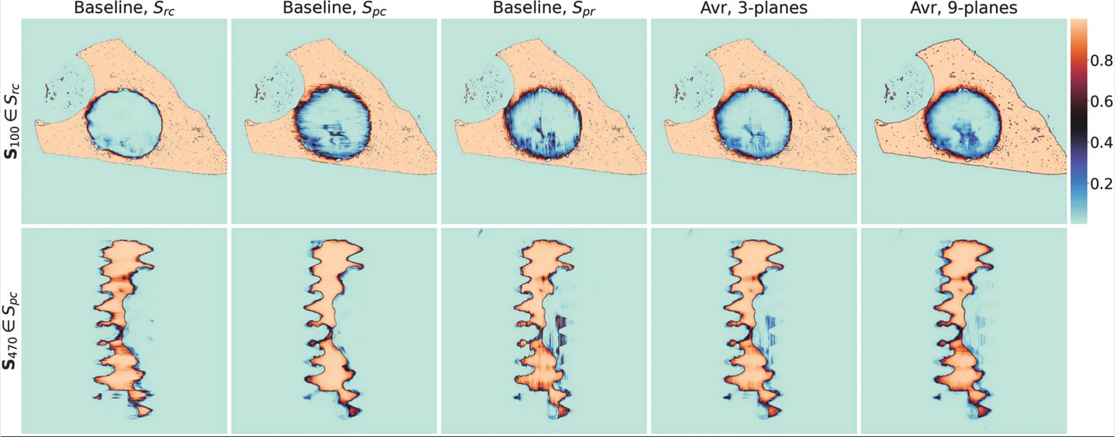 Highly accurate segmentation of large 3D volumes is a demanding task. Challenging applications like the segmentation of synchrotron radiation microtomograms (SRμCT) at high-resolution, which suffer from low contrast, high spatial variability and measurement artifacts, readily exceed the capacities of conventional segmentation methods, including the manual segmentation by human experts. The quantitative characterization of the osseointegration and spatio-temporal biodegradation process of bone implants requires reliable, and very precise segmentation. We investigated the scaling of 2D U-net for high resolution grayscale volumes by three crucial model hyper-parameters (i.e., the model width, depth, and input size). To leverage the 3D information of high-resolution SRμCT, common three axes prediction fusing is extended, investigating the effect of adding more than three axes prediction. In a systematic evaluation we compare the performance of scaling the U-net by intersection over union (IoU) and quantitative measurements of osseointegration and degradation parameters. Overall, we observe that a compound scaling of the U-net and multi-axes prediction fusing with soft voting yields the highest IoU for the class “degradation layer”. Finally, the quantitative analysis showed that the parameters calculated with model segmentation deviated less from the high quality results than those obtained by a semi-automatic segmentation method.