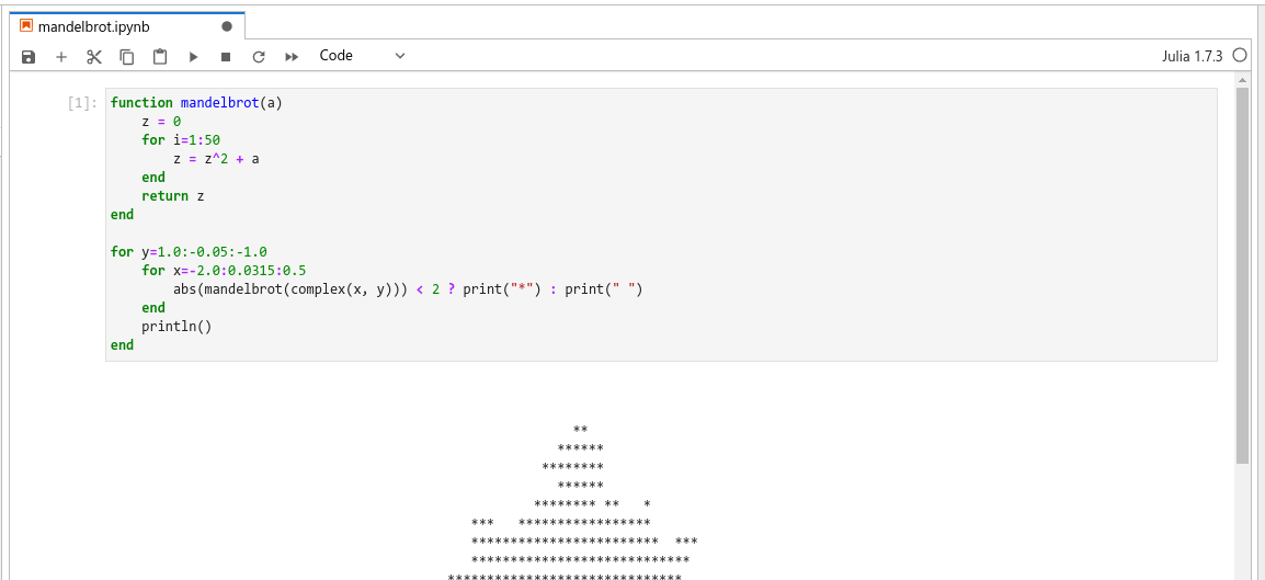 Julia comes with a full-featured interactive command-line REPL (read-eval-print loop) built into the julia executable. In addition to allowing quick and easy evaluation of Julia statements, it has a searchable history, tab-completion, many helpful keybindings, and dedicated help and shell modes. The REPL can be started by simply calling julia with no arguments or double-clicking on the executable. (Julia Documentation REPL)