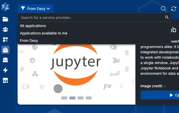 A filter symbol can be found at the top left. There, we can select applications that have been integrated specifically for DESY users.
